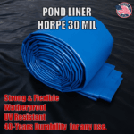 We offer a new, freshly cut, 100×185 (185 ft by 100 ft), 185×100, 100*185, 185*100, (100 by 185), (185 by 100), (100 ft by 185 ft) pond liner that contains 18500 square feet of HDRPE. (Reinforced High-Density Polyethylene) 100% tested, 30 mills, 40 years, limited warranty, UV protection, fish safe, NSF certified for drinking water and very easy to use. No foundation required for most uses. It is Made in America, under the best quality and environmental standards. We ship directly via FEDEX, UPS. DHL or other to your door. This is our best-selling commercial grade pond liner, suitable for most uses, from ponds and lakes to mining and infrastructure.